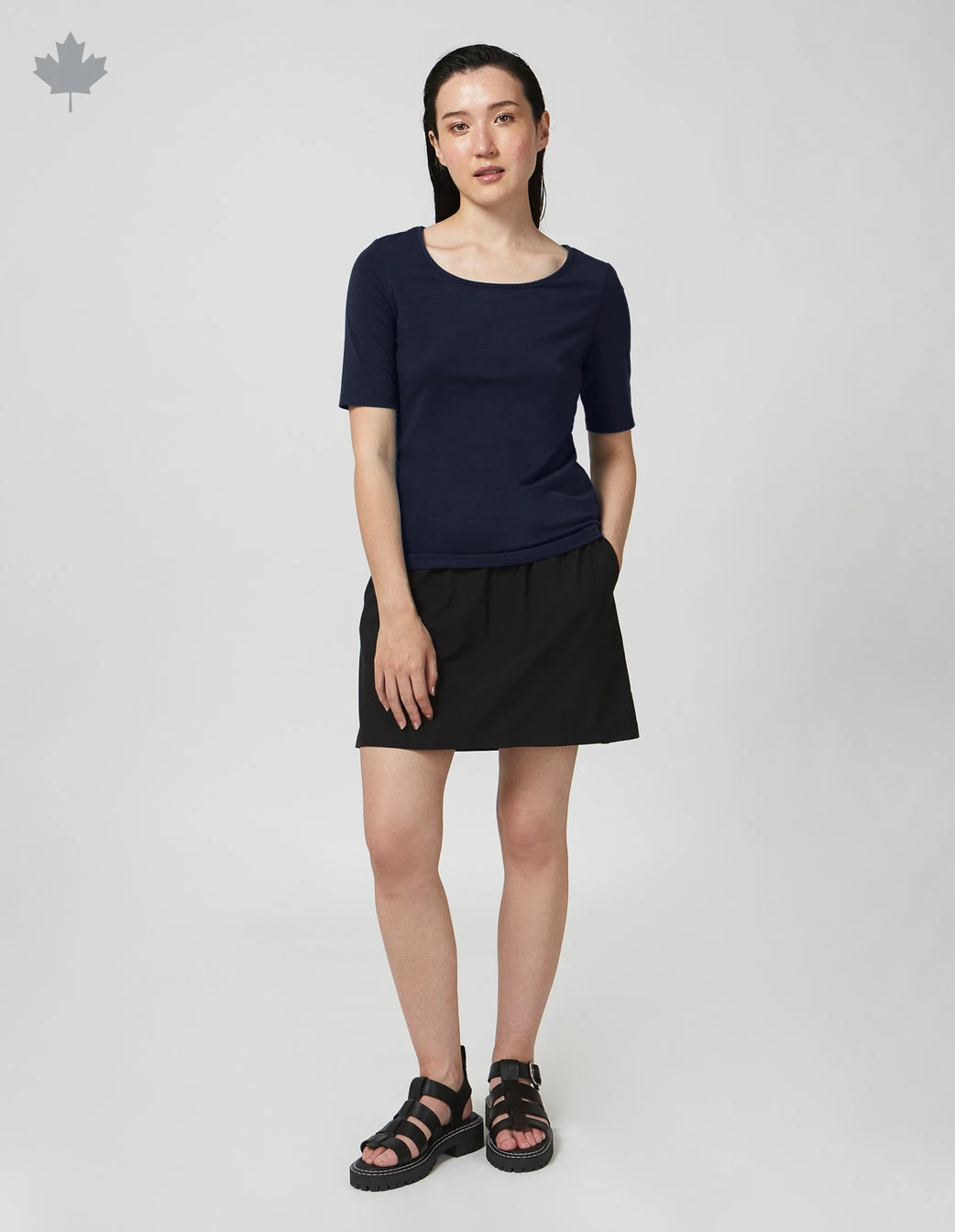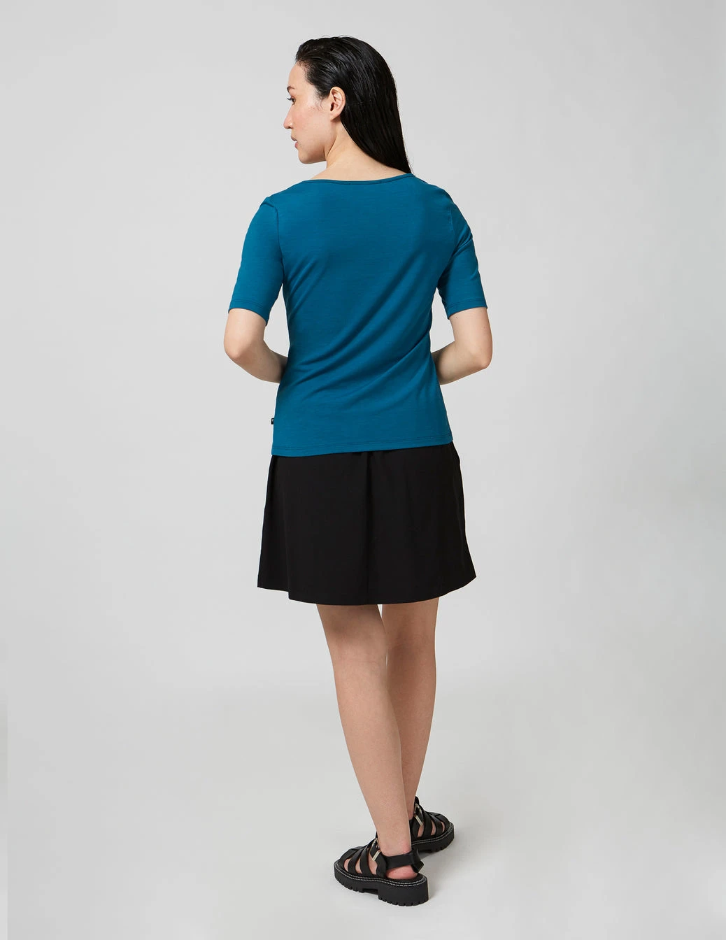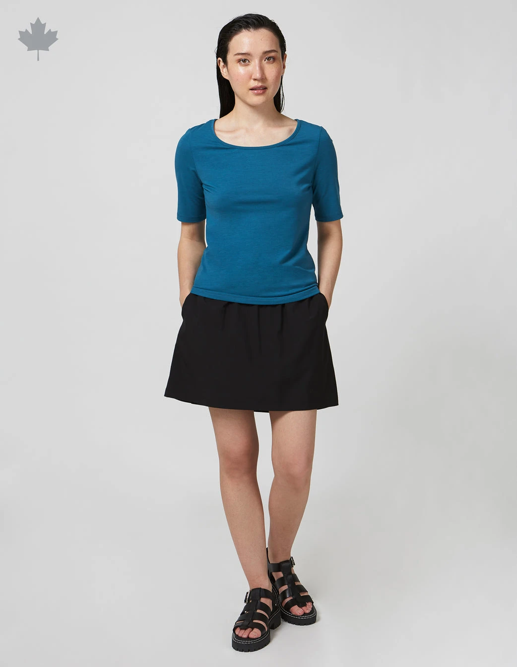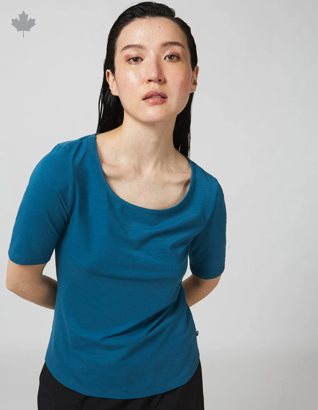 Elbow length sleeve top made with drirelease® Eco, which is made with recycled polyester, created by using post-consumer plastic bottles. Semi-fitted top with scoop neck top.