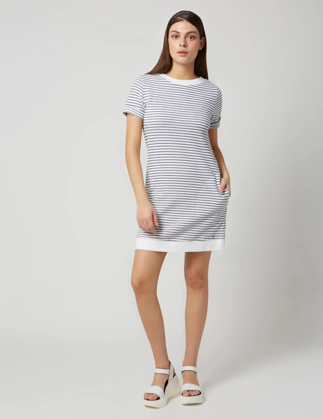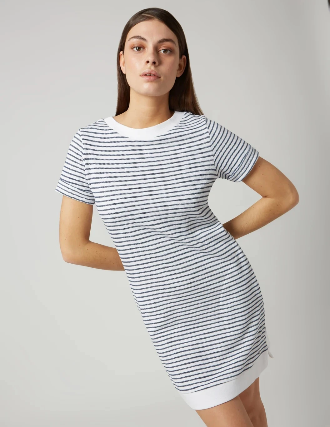Comfortable round neckline shift dress with rib at neckline and hem, cuffed sleeves, on-seam front pockets and slits at side hem.