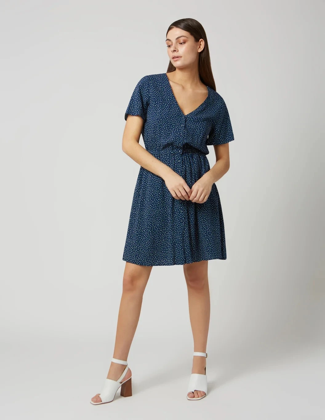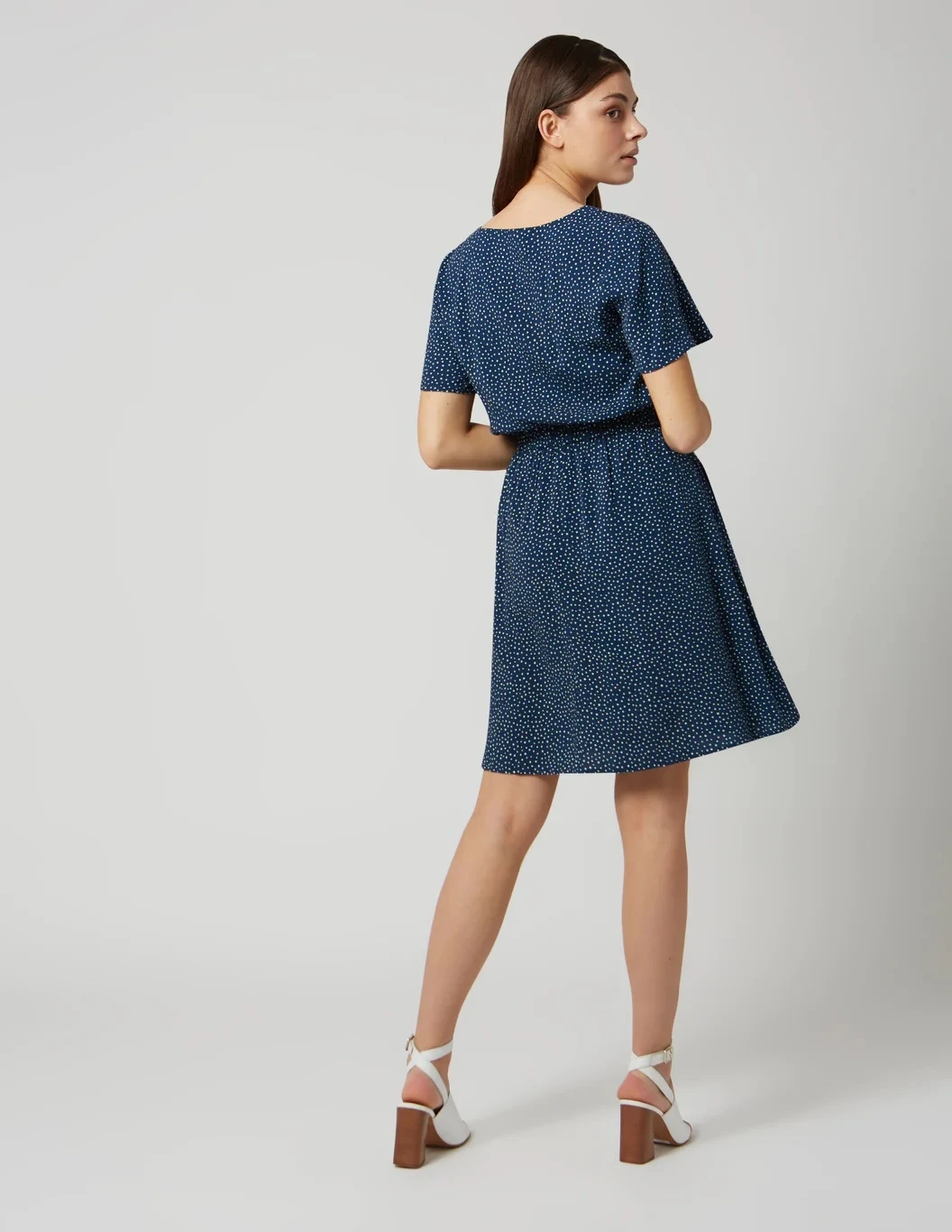 Short-sleeve flared knee-length dress, elasticized waistband, two slant pockets at the front and a button closure at the front.