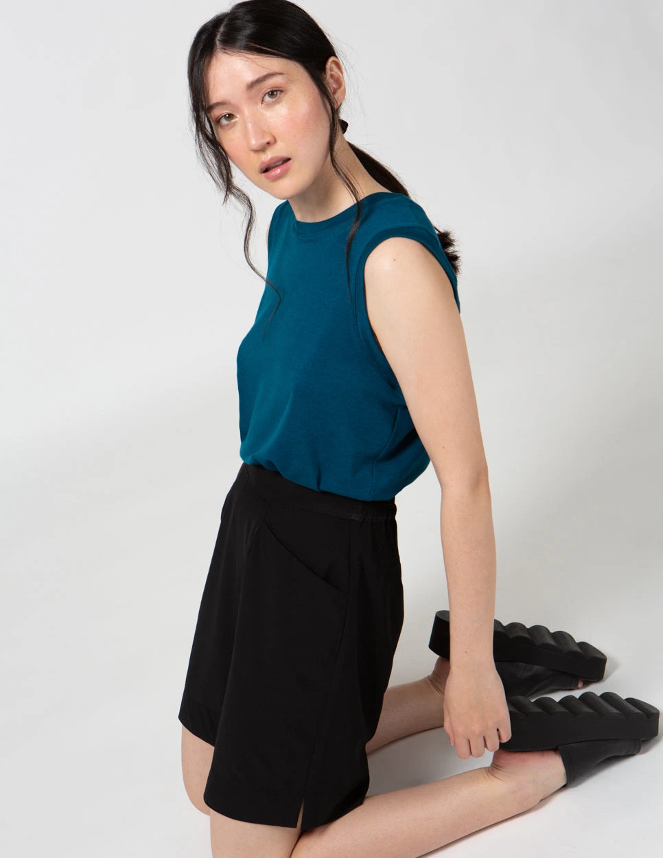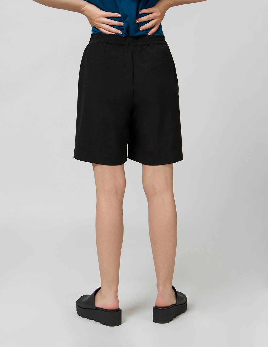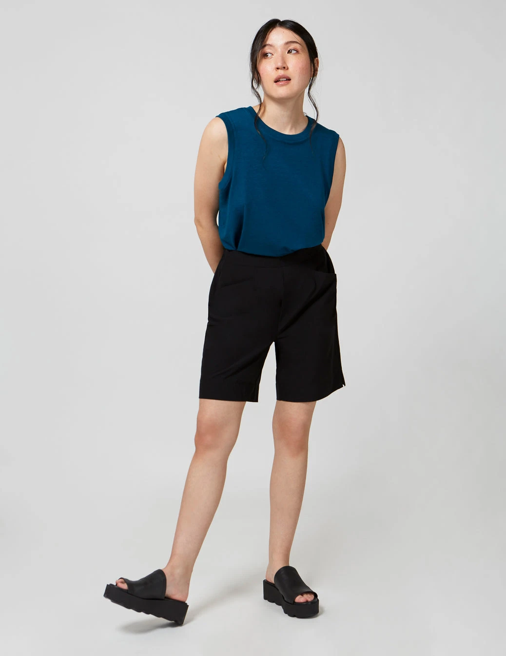 Bermuda short with elastic at back waistband made with Repreve® certified recycled polyester, which is made from post-consumer plastic bottles. Mid-rise short with slant pockets at front, secret pocket with YKK® zipper on right side, fake welt pockets at back, slits at hem, fake fly at front, and reflective print inside back hem.
