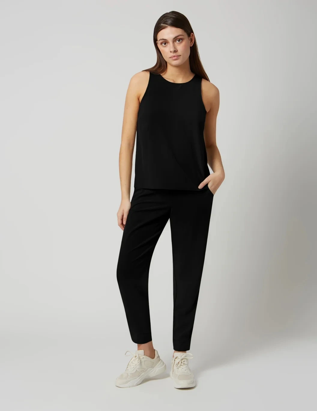 Sleeveless top with round neckline, semi-fitted, darts at the chest, laser cut hole detail at the back and laser cut hem.