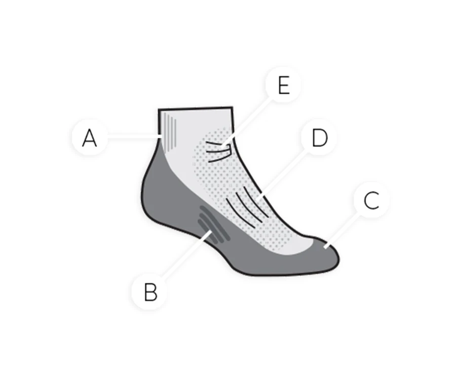 C – Seamless toe closure to reduce bulk and prevent blisters