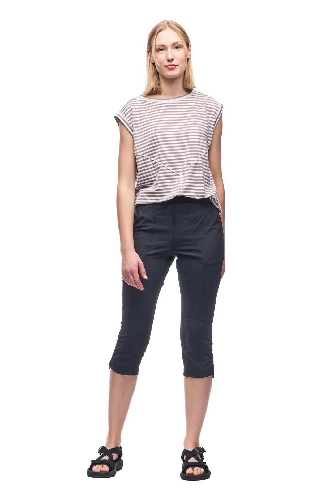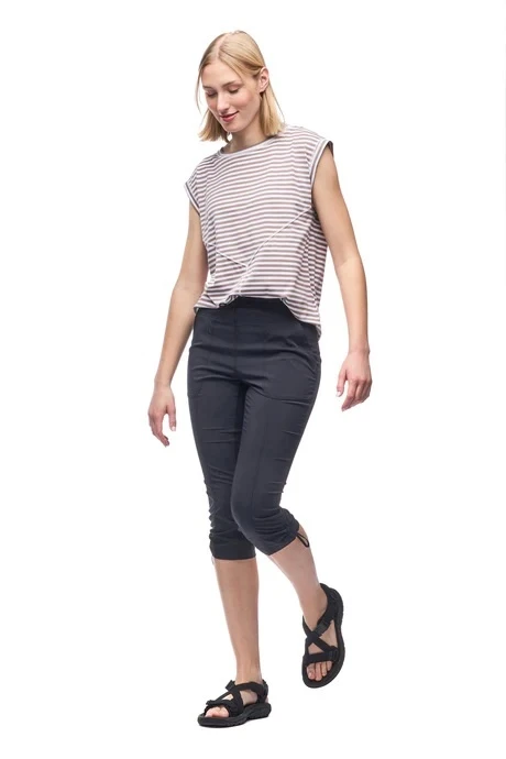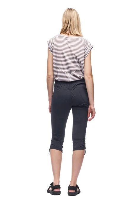 An high waist capri made of woven stretch fabric that is light, strong and 2-way stretch and offers ease of movement, dries quickly and wicks away moisture. The Nakato IV pant has an elastic waistband with drawstring adjustment, two front hand pockets and a secure zipped pocket at back. These features make this pant versatile, great for hiking, travel and various outdoor activities. Made from OEKO-TEX certified nylon fabric.