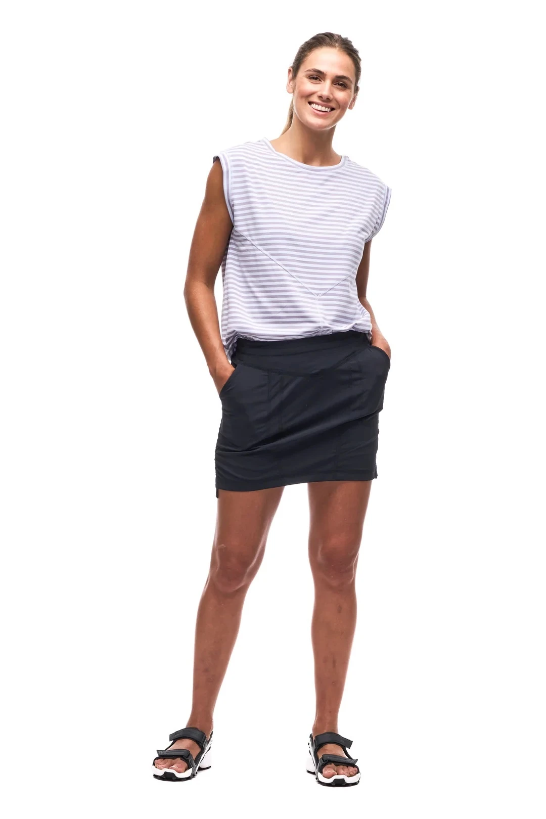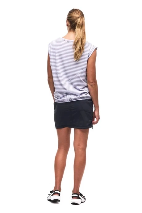 A regular waist skort made of woven stretch fabric that is light, strong and 2-way stretch and offers ease of movement, dries quickly and wicks away moisture. The Ulendo IV skort has an elastic waistband, an inner short, two front hand pockets and a back zipped pocket. These features make this skort versatile, great for hiking, travel and various outdoor activities. Made from OEKO-TEX certified nylon fabric.