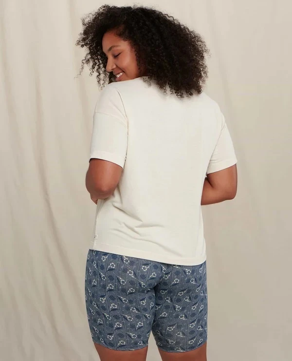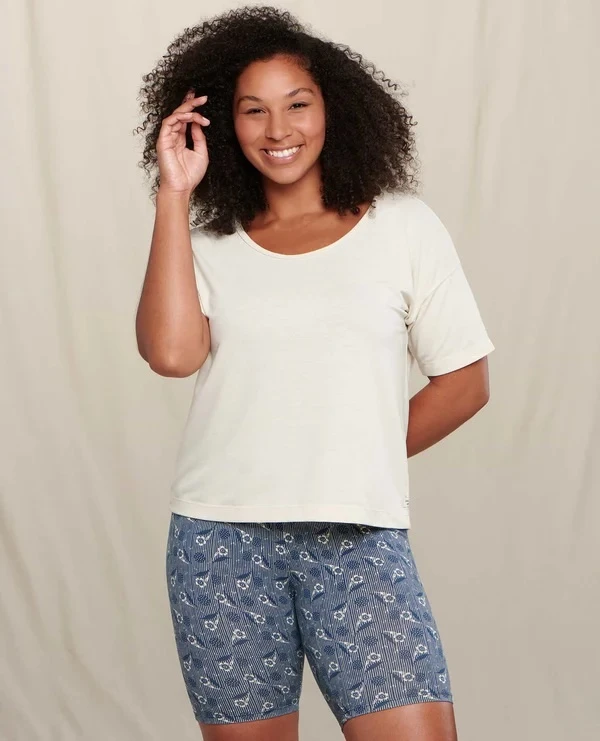 Fit: Relaxed fit with a slight crop (23” length). A scoop neck and drop shoulder to keep things loose and flowy.