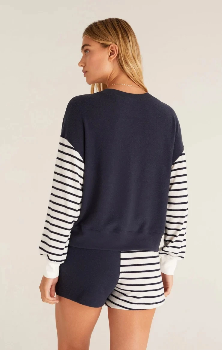 The Color Block Stripe Long Sleeve Top is made using the coziest Brushed Sweater Knit fabric and features a relaxed, cropped fit that hits at the waistband. This drop sleeve, crew neck pullover has a classic stripe at the sleeves and makes a matching set with the Color Block Stripe Short.